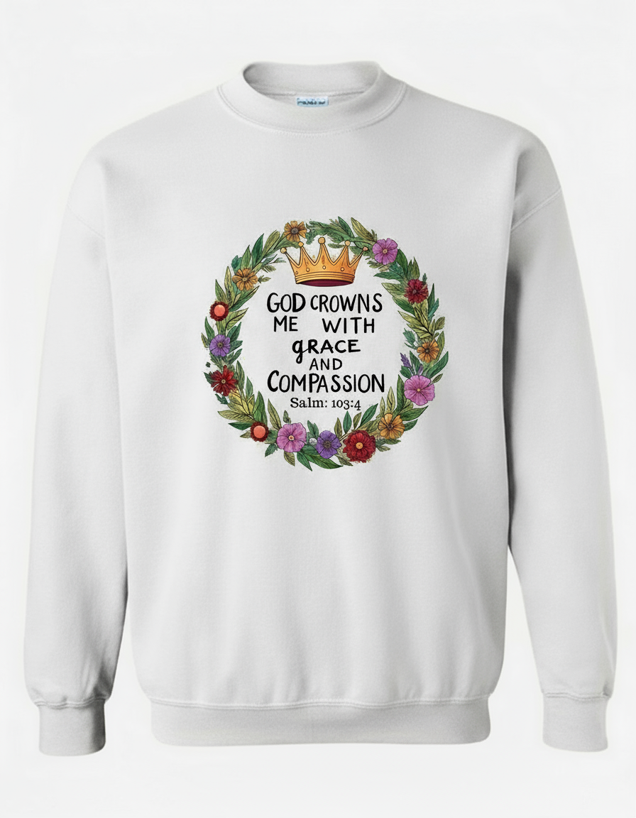 Descubre el suéter God Crowns Me With Grace & Compassion, una prenda diseñada para recordarte cada día que la gracia siempre te acompaña.